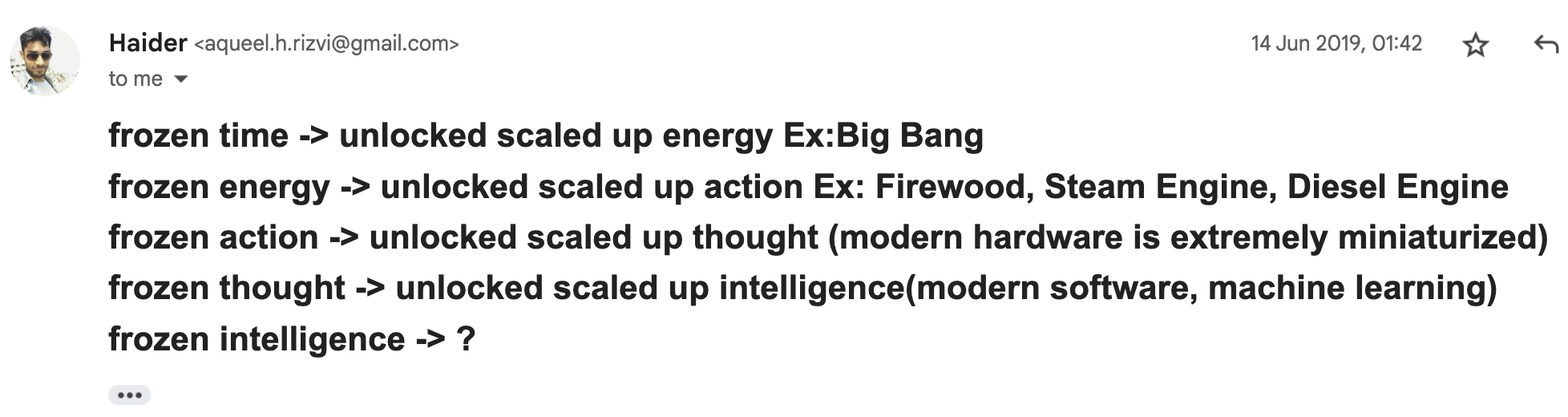 To my utter amusement, I ended up reaching all the way for the Big Bang theory itself, which felt as if a moment from the eponymously named show had come to life. Feeling a mix of happiness and embarrassment at what I had done, I just filed my thoughts in a self-addressed email, which is how I usually record such fleeting thoughts.